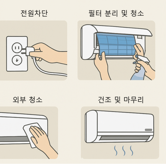- 안전을 위해 에어컨의 전원을 완전히 끄고 플러그를 뽑습니다.