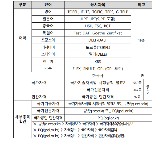 - 어학 19종, 한국사, 국가기술자격 540종, 국가전문자격 347종*, 국가공인 민간자격 97종